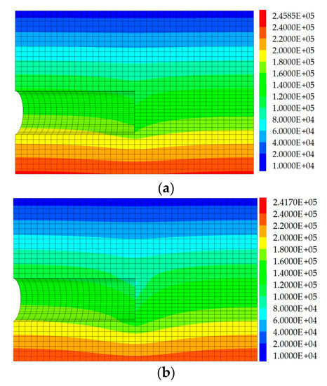 Figure 3 shows the cloud image of the pore water pressure distribution obtained by numerical simulation. According to the numerical simulation results, it is found that the pore water pressure in the front and back of the tunnel face is symmetrical. Therefore, this paper expands the three-dimensional solution for the pore water pressure distribution of Equations (1) and (2), which did not consider the pore water pressure distribution behind the tunnel face, into Equation (3), which comprehensively considers the pore water pressure distribution directly in front of the tunnel face, the upper formation in front of the tunnel face and the upper formation behind the tunnel face.