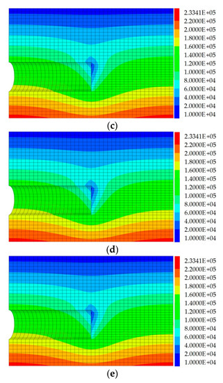 Cloud image of the pore water pressure distribution. (a) The friction angle of the soil = 37°; the hydraulic head difference between the tunnel face and the ground surface = 0.5 ; (b) = 37°; = 1.0 ; (c) = 37°; = 2.0 ; (d) = 31°; = 2.0 ; (e) = 25°; = 2.0 (unit: Pa).