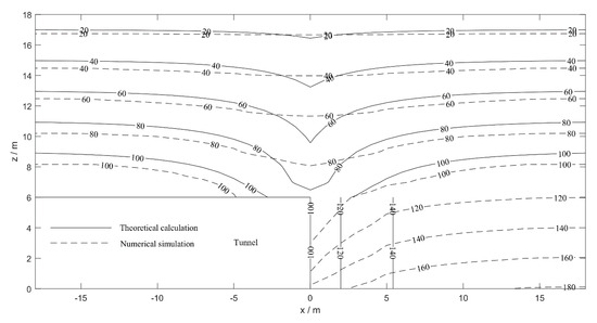 Figure 4 shows the distribution of pore water pressure on the vertical symmetrical plane of the tunnel obtained by numerical simulation and theoretical calculation in this paper. It can be seen from Figure 4 that the pore water pressure distribution law above the tunnel face obtained by the two methods is the same (the maximum relative error is less than 15%), both of which take the tunnel face as the symmetrical plane. Directly above the tunnel face, the pore water pressure gradient calculated by theory is obviously larger than that of the numerical simulation, which will make the seepage force in the theoretical calculation larger and make the limit support pressure of the tunnel face larger, and give the calculation result more safety. As the ground directly in front of the tunnel face is mainly affected by the horizontal seepage force [18], the pore water pressure on the central axis of the tunnel represents the pore water pressure on the ground directly in front of the tunnel face. According to the distribution of pore water pressure on the central axis of the tunnel in Figure 4, the theoretical calculation is basically consistent with the numerical simulation results. Based on the above analysis, it is safe to apply the pore water pressure calculated according to Equation (3) to calculation of the limit support pressure of the tunnel face.