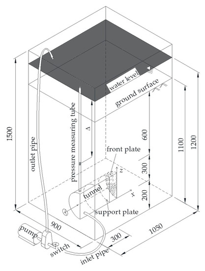 Figure 5 shows the test model of excavation-seepage instability of the shield tunnel established by Mi and Xiang [3]. Different seepage fields are generated by regulating the pump switch. By rotating the runner of the tunnel model, the support plate moves backward gradually until the ground is unstable and damaged. In the process of the support plate moving backward, the ground settlement and the support pressure of the tunnel face are monitored. Based on analysis of the monitoring data, the ground collapse range and the limit support pressure of the tunnel face are obtained.