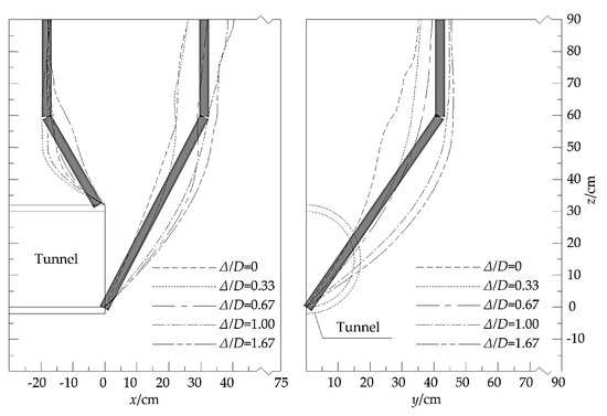 Figure 6 shows the ground collapse range of the vertical symmetry plane in the center of the tunnel and the plane in front of the tunnel face under different seepage conditions based on the physical model tests of Mi and Xiang [3]. Here, is the hydraulic head difference between the tunnel face and the ground surface and is the tunnel diameter. It can be seen from Figure 6 that when the support pressure of the tunnel face is not enough, the ground in front and behind the tunnel face will lose stability within a certain range. The collapse range boundary in front of the tunnel face extends from the bottom of the tunnel to the upper part of the tunnel at a certain angle and reaches a certain height, and then extends vertically to the ground surface. The collapse range boundary behind the tunnel face extends from the top of the tunnel to the rear and up at a certain angle and reaches a certain height, then extends vertically upward to the ground surface. The horizontal collapse range boundary extends from the bottom of the tunnel to the upper side at a certain angle and reaches a certain height, then extends to the ground surface vertically.