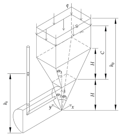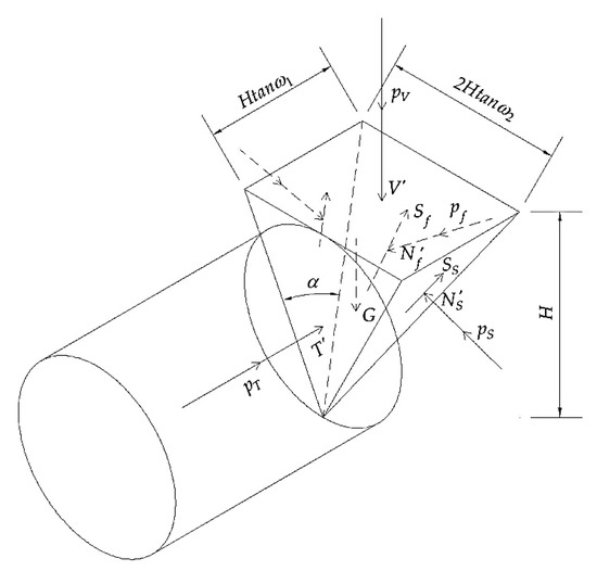 According to the ground collapse range in Figure 6, considering the symmetry of the tunnel, a failure model considering the influence of seepage, as shown in Figure 7, is established. This model consists of three parts: a pyramid, a prismoid and a prism from bottom to top. Here, is the equivalent height of the tunnel (in this paper, ); is the cover thickness of the tunnel; is the hydraulic head of the ground surface; is the hydraulic head of the tunnel face; is the additional pressure on the ground surface; is the break angle in front of the tunnel face; is the horizontal break angle; is the break angle behind the tunnel face.