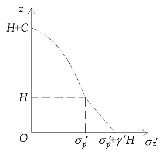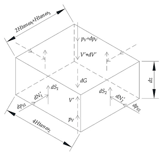 In order to simplify the calculation, it is assumed that the vertical effective compressive stress in the prismoid continues the change rule in the prism; that is, within the range , the vertical effective compressive stress can be obtained by Equation (10). When , the vertical effective compressive stress of the interface between the prismoid and the pyramid can be obtained, that is, .