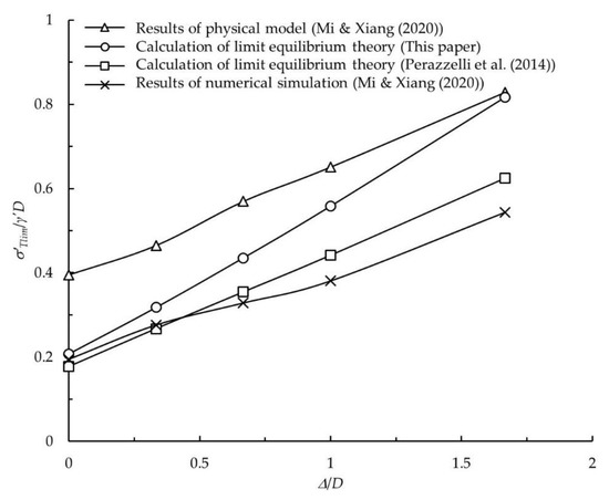 In order to verify the correctness of the theoretical solution for the limit equilibrium in this paper, the physical model test parameters of Mi and Xiang [3] are used for calculation, and the calculation results are compared with the physical model test results [3], the existing theoretical calculation results of the limit equilibrium [11] and the numerical simulation results [3], respectively. The diameter of the tunnel is 0.3 m; the covering thickness is 0.6 m; the hydraulic head of ground surface is 1.0 m; the hydraulic head of the tunnel face is 1.0, 0.9, 0.8, 0.7 or 0.5 m; the saturated weight of soil is 21.2 kN/m3; the friction angle of the soil is 37°; the cohesion of the soil is 0; the additional pressure on the ground surface is 0.