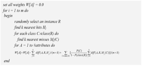The function diff(Attribute; Instance1; Instance2) computes the difference of the attribute’s values obtained in two instances. For discrete attributes, the difference is either 1 (different values) or 0 (the same values), while for continuous attributes the differences are normalized on the interval [0, 1]. Kononenko [106] notes that the higher the number of instances, the more reliable ReliefF’s estimates but the running time also increases. The ReliefF algorithm is given in Figure 2. We used Weka software [99] to perform the feature selection algorithms.