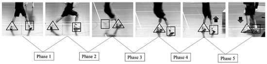 - Phase 2 (cross-over step): from the end of Phase 1 to the entire setting of the left foot after crossing it over the right foot.