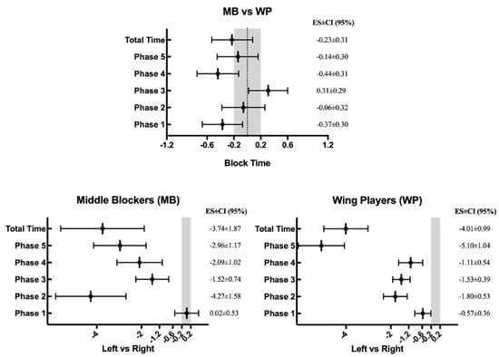 In each player role, MBs exhibited statistically significant fast movements to the right side in Phase 2 (z = −4.10; p = 0.001), Phase 3 (z = −3.60; p = 0.001), Phase 4 (z = −2.87; p = 0.004) and flying time (Phase 5 (z = −3.70; p = 0.001)). With the same tendency, WPs showed a statistically significant fast displacement to the right side in all measured phases: Phase 1 (z = −2.59; p = 0.010), Phase 2 (z = −5.54; p = 0.001), Phase 3 (z = −6.69; p = 0.001), Phase 4 (z = −3.03; p = 0.002), Phase 5 (z = −8.02; p = 0.001), and total block time (z = −5.20; p = 0.001). The rightward movement, however, showed more variability in all player roles, and in all movement phases. Finally, the effect size demonstrated large and very large differences, with a slower leftward movement in all players.