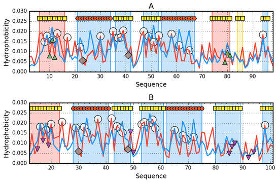 Hydrophobicity density distribution profiles for 1URR (A) and chain A of 2BJD (B): theoretical (T—blue line) and observed (O—red line). Markers at the top denote secondary structure fragments (red hexagons—helices, yellow squares—sheets). Fragments marked by red shade exhibit RD (relative distance) > 0.5. Fragments marked by blue shade exhibit RD ≤ 0.5. Yellow region on A—RD close to 0.5. Green triangle markers (facing up) denote residues engaged in ligand binding. Purple triangles (facing down) denote protein-protein interaction. Catalytic residues are shown as brown rhombuses, while members of the hydrophobic core are marked by white circles.