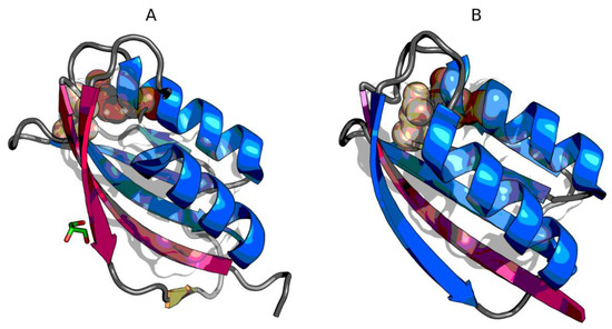3D presentation of 1URR (A) and chain A of 2BJD (B). Fragments marked by red color exhibit RD > 0.5. Fragments marked by blue color exhibit RD ≤ 0.5. Yellow fragment on A—RD close to 0.5. Catalytic residues are shown as spheres (darker color—23R in 1URR and 30R in 2BJD, lighter color—41N in 1URR and 48N in 2BJD). Member of the hydrophobic core are represented by semi-transparent surface inside each protein.