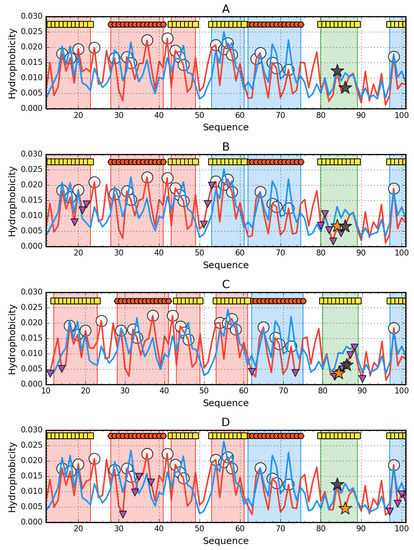 Hydrophobicity density distribution profiles for monomers of 4OIX (A), 4OJ3 (B), 4OJG (C), 4OJH (D): theoretical (T—blue line) and observed (O—red line). Markers at the top denote secondary structure fragments (red hexagons—helices, yellow squares—sheets). Fragments marked by red shade exhibit RD > 0.5. Fragments marked by blue shade exhibit RD ≤ 0.5. Green fragments—β-strand with mutations. Purple triangles (facing down) denote protein-protein interaction. Orange stars mark the mutation in given protein, while black stars mark the mutations in other proteins.