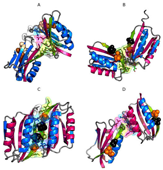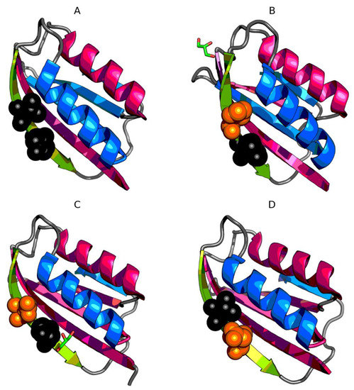 3D presentation of monomers of 4OIX (A), 4OJ3 (B), 4OJG (C), 4OJH (D). Fragments marked by red color exhibit RD > 0.5. Fragments marked by blue color exhibit RD ≤ 0.5. Green fragments—β-strand with mutations. Orange spheres mark the mutation in given protein, while black spheres mark the mutations in other proteins.