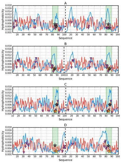 Hydrophobicity density distribution profiles for dimers of 2BJD (A), 4OJ3 (B), 4OJG (C), 4OJH (D): theoretical (T—blue line) and observed (O—red line). Green fragments—β-strand with mutations. Purple triangles (facing down) denote protein-protein interaction. Orange stars mark the mutation in given protein, while black stars mark the mutations in other proteins. Dashed vertical line is the chain separator.