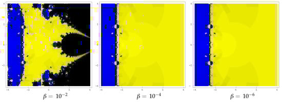 In this example, we consider the polynomial , which has zeros with multiplicity two. For this situation, we utilize a square shape of size and allot the shading of yellow and blue to each underlying point in the attraction basin of zero “” and “”. The basins obtained for the method appear in Figure 1 for the parameter values . Observing the behavior of Method (3), we see that the basins become more qualitative as parameter β accepts small values.