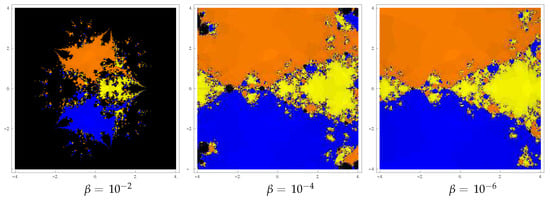 Let us take the polynomial having zeros with multiplicity three. To see the dynamical view, we consider a square with shades of orange, yellow, and blue to each underlying point in the basins of attraction of zero “”, “”, and “”. Basins for proposed method (3) appear in Figure 2 corresponding to parameter values . Analyzing the shape of the basins, we see that the basins become enlarged with smaller values of parameter β.