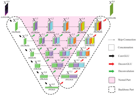 In our proposed GNU-Net model, only the backbone of GNU-Net (two dashed line columns shown in Figure 2) is applied with GLUs, not including nested subnetworks. We use convolution GLU block (black arrow show in Figure 2) and deconvolution GLU block (red arrow show in Figure 2) instead of convolution layer and deconvolution layer in the backbone part. Figure 2 clearly exhibits the details of concatenation operation, skip-connection, and GLU blocks. The triangularlike shadow area same as nested part. So, we rewrite Equation (4) as follows: