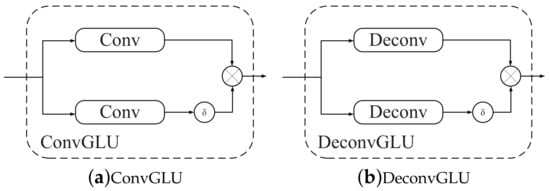 A convolutional GLU block (denoted as “ConvGLU”) is illustrated in Figure 3a. A deconvolutional GLU block (denoted as “DeconvGLU”) is analogous, except that the convolutional layers are replaced by deconvolutional layers, as shown in Figure 3b.