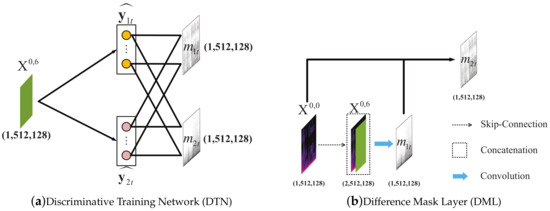 In our singing voice and accompaniment separation tasks, there are just two sources, so . So, as shown in Figure 4b, the output and the mixture spectrum input are concatenated, forming a feature map with dimensions . Through a convolutional network with the filter size of followed with a Sigmoid activation operation, the difference mask layer outputs a mask of source 1 with the dimensions . , computed by Equation (13), can be obtained as the mask of source 2 simultaneously.