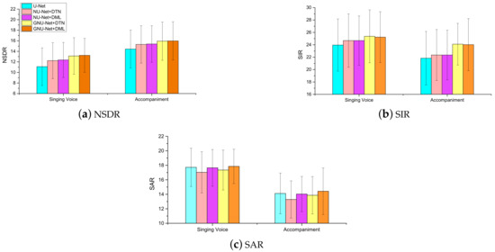 The performance of GNU-Net separation model was evaluated on iKala dataset. Table 2 shows the performance scores of various models with 6-level nested U-Net and 6-level U-Net [26]. In the first row, the results of singing voice and accompaniment are based on two U-Net separation models, as the U-Net [26] model can output only one source signal, while our proposed model can output estimated singing voice and accompaniment simultaneously. NU-Net denotes nested U-Net without introducing GLUs. The contents of Table 2 are exhibited in another form in Figure 5, which can help to intuitively distinguish various models by the means and variances of various evaluation metrics. From Table 2 and Figure 5, we can conclude the following statements: