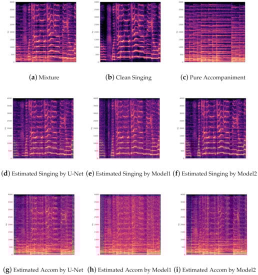 (a) The mixture magnitude spectrogram of a clip in iKala dataset; (b,c) the ground truth spectra of clean singing voice and pure accompaniment; (d–f) the magnitude spectra of estimated singing voice by U-Net model and our proposed two models; (g–i) The magnitude spectra of estimated accompaniment by U-Net model and our proposed two models (model1, NU-Net+DML; model2, GNU-Net+DML). Accom denotes accompaniment.