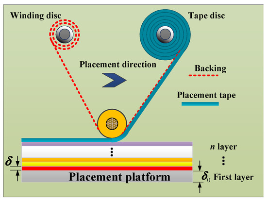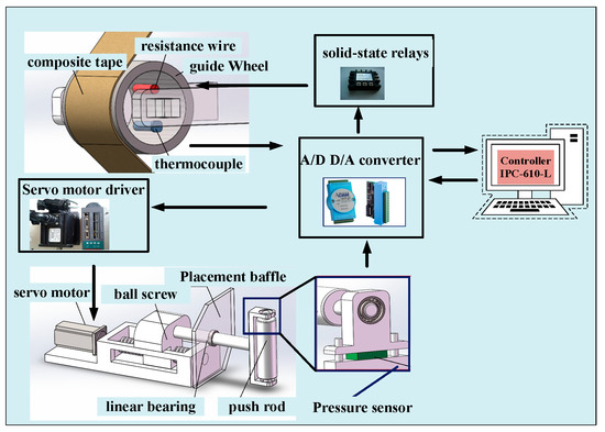 Composite materials have a series of advantages, such as being light weight, anti-fatigue, having corrosion resistance, high modulus, high strength and strong designability, and have been widely used in many industrial fields, especially in large-scale integral structure and aviation components [1,2,3,4,5,6,7]. Composite tape placement technology is one of the common methods in the composite forming process. The final properties of composite products are very sensitive to parameters. The performance of composite products is directly related to the selection and control accuracy of parameters such as placement temperature, pressure and speed. Placement pressure is an important parameter of the composite tape placement forming process. Choosing an appropriate pressure interval value and having an excellent pressure control system can improve resin content and homogeneity of placement products, reduce void content and enhance density [8,9,10].