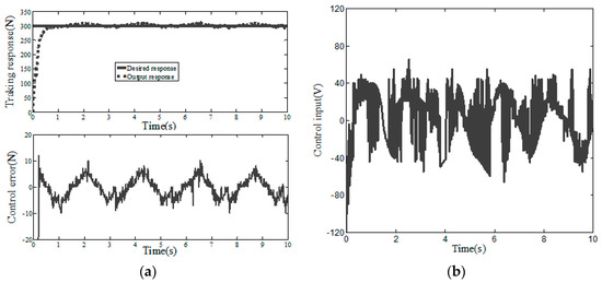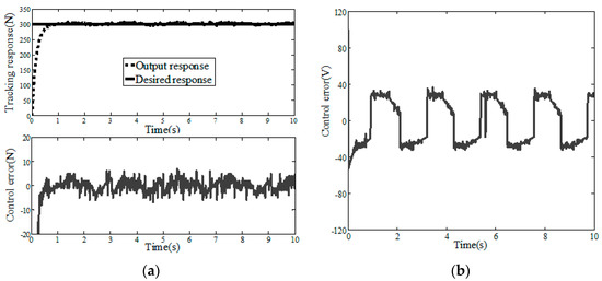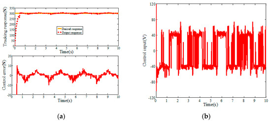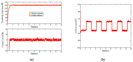 In order to verify the effectiveness of the ASMC-DOB algorithm, the hardware-in-the-loop simulation experiment is carried out, and the mathematical model of the placement pressure control system is taken as the controlled object. A step signal (r1(t) = 300 N) is used for positioning control, and relevant parameters of placement pressure control system are shown in Table 1. The simulation results of step response are shown in Figure 8, Figure 9 and Figure 10. Figure 8 and Figure 9 are the step response simulation results of PID and SMC, respectively. The control error of PID step response and SMC step response are 12.58 N and 6.28 N, respectively. The SMC algorithm has strong robustness and can effectively reduce the control error compared with the PID algorithm. However, it can be seen in Figure 9 that the sliding mode control has large high-frequency chattering, which will affect the system structure and damage the sensor. In order to reduce the high frequency chattering of the control input, the ASMC-DOB control algorithm is proposed. Figure 10 shows that the control error is 3.46 N. Compared PID and SMC, the control error of the design ASMC-DOB is reduced by 72.5%, and 41.3%, respectively.