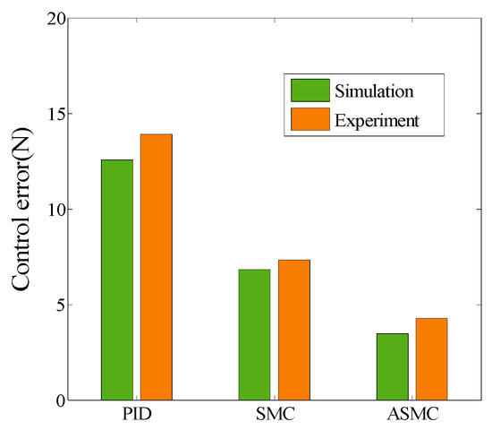 In this experiment, IPC-610-L is used as the controller carrier, and C++ is used to write the experimental program. The designed control programs include sampling, pressure sensor measurement function and digital and analog signal conversion. A digital I/O card (PCL-730), Advantech 2-way isolated analog output card (PCI-728) and data acquisition card (PCI-1680U) are used for conversion, acquisition and data output, respectively. The experiment is carried out on CH#2 composite tape placement equipment. The experimental results are shown in Figure 11, Figure 12 and Figure 13, and the simulation and experimental results have the same trend. It can be seen from Table 2 and Figure 14 that ASMC-DOB control input chattering and control error are smaller than PID and SMC, and the ASMC-DOB reduces the control errors of step response by 41.7% and 69.2%, respectively.