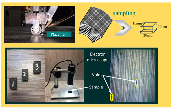 In order to further verify the effectiveness and feasibility of ASMC-DOB, different control algorithms were used to carry out the placement experiment, and observation of the change of void content of composite products. Void content is an important index to measure the product’s mechanical properties. There are many ways to measure void content, such as density measurements by microscopy [30,31,32,33,34,35,36,37], detection method of ultrasonic attenuation [38] and computed tomography, which can also be performed using X-rays [39]. In GB/T3365-2008 [40], an electron microphotography method is proposed, which provides the highest void content detection accuracy. Sampling and void content measurement processes are shown in Figure 15. The samples are polished and ground under flowing water, and then observed by microscope.