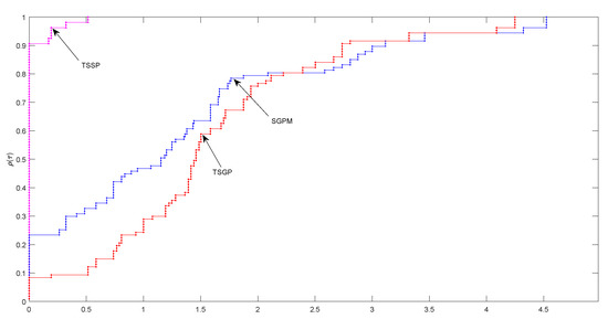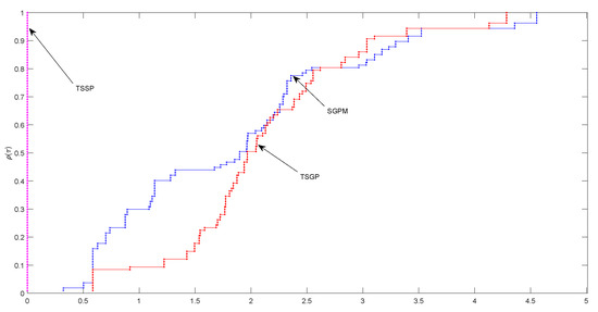 Second experiment. This experiment presents the computational advantage of the proposed method in comparison with the two existing methods mentioned above based on ITER, FVAL and TIME. All the test problems were solved using the starting points in Table 1 with three (3) different dimensions 50,000 and 100,000. In this experiment, we take The results obtained by each solver are reported in Table 3 and Table 4. The NORM results presented in Table 3 and Table 4 show that each solver successfully obtained solutions of all the test Problems 1–6. However, it is clear that the TSSP algorithm obtained the solutions of virtually all the test problems with least ITER, FVAL and TIME. These information are summarized in Figure 1, Figure 2 and Figure 3 based on the Dolan and Mor performance profile [26]. This performance profile tells the percentage win by each solver. In all the experiments, we see from Figure 1, Figure 2 and Figure 3 that the proposed TSSP algorithm performs better with higher percentage win based on ITER, FVAL and TIME for solving all the test problems. In fact, the TSSP algorithm recorded 100 percent least FVAL for all the test problems.