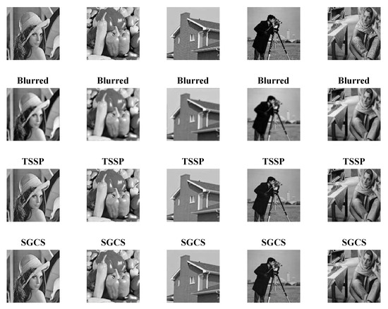 The original images (first row), the blurred images (second row), the restored images by methods TSSP (third row) and SGCS (last row).
