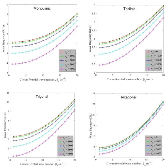 Figure 2 explores the effect of flow velocity on the variation of wave frequency of anisotropic cylindrical shells against the circumferential wave number. As observed, at a constant longitudinal wave number, with increasing circumferential wave number, wave frequency increases in every anisotropic cylindrical shell. There is a damping effect due to the existence of fluid flow in the cylindrical shell. Hence, flow velocity has a decreasing influence on the value of wave frequency in such a way that wave frequency is lessened with an increase of flow velocity amount. Flow velocity affects wave frequency values of hexagonal materials less than other ones. The diagrams have a similar trend but there is a difference in the value of wave frequency of these diagrams. Hexagonal, trigonal, monoclinic, and triclinic materials experience the greatest value of wave frequency, respectively. This behavior is because the hexagonal crystal system of anisotropic materials possesses greater stiffness in comparison with the crystal systems of other materials.