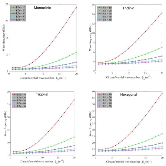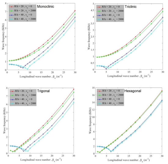 Figure 3 indicates the variation of wave frequency of anisotropic cylindrical shells against circumferential wave number for different radius to thickness ratios (R/h). Based on the graphs, it can be seen that at a constant flow velocity, radius to thickness ratio plays a decreasing role in the variation of wave frequency values. This behavior is because the increment of radius to thickness ratio makes the structure weaker and hence higher values of wave frequency occur with lower radius to thickness ratios. Similarly to Figure 2, hexagonal and triclinic materials have the highest and lowest wave frequency values, respectively. Also, wave frequency value increases with increase in circumferential wave number.