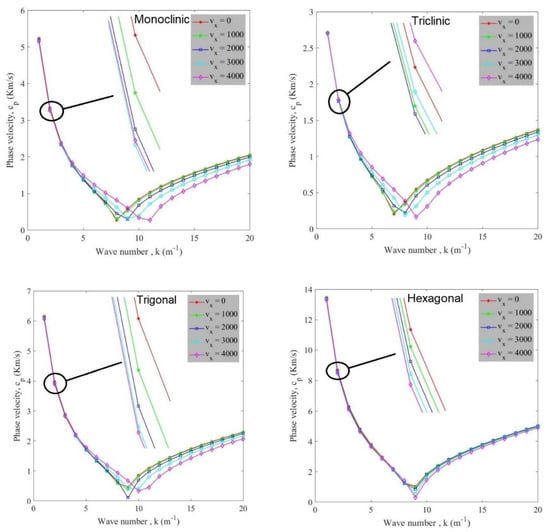 Variation of phase velocity of anisotropic cylindrical shells against wave number for different flow velocities is demonstrated in Figure 4. It can be observed that by increasing the number of waves, phase velocity is initially reduced to its minimum value and it then increases. The minimum points of each curve represent the critical wave number for the corresponding flow velocity. In other words, critical flow velocity, in which a structure losses its stability, happens at a certain wave number. For example, in triclinic shell, k = 7 is related to vx = 0 and vx = 1000, k = 8 is related to vx = 2000 and vx = 3000, and k = 9 is related to vx = 4000; in monoclinic shell, k = 8 is related to vx = 0 and vx = 1000, k = 9 is related to vx = 2000 and vx = 3000, and k = 11 is related to vx = 4000; and in trigonal shell, k = 9 is related to vx = 0, vx = 1000 and vx = 2000 and k = 10 is related to vx = 3000 and vx = 4000; and finally, in hexagonal shell, k = 9 is related to all of the flow velocities. Besides, flow velocity possesses a negative effect on the variation of phase velocity values and this negative effect is owing to the aforementioned damping influence.