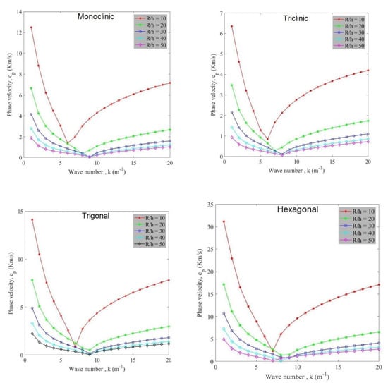 The influence of radius to thickness ratio on the variation of phase velocity of anisotropic cylindrical shells against wave number is studied in Figure 5. It is observable that higher phase velocity can occur by selecting a lower amount of radius to thickness ratio. On the other hand, as mentioned before, the increment of radius to thickness ratio affects the value of phase velocity decreasingly. Phase velocity firstly is decreased and then increases with the growth of wave number amount. These diagrams are plotted at vx = 2000 and based upon these diagrams it can be expressed that at a certain flow velocity, by varying radius to thickness ratio, critical wave number changes. For more explanation, it can be said that critical flow velocity can happen at various wave number and it depends on the amount of radius to thickness ratio. Also, as same as other illustrations, triclinic, monoclinic, trigonal and hexagonal possess the lowest value of phase velocity, respectively.