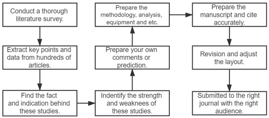 Researchers have developed mature guidelines for writing different kinds of review articles in various fields. Machi et al. provided a classic six-step of how to write a review article [23]. Wee et al. discussed the significance of why and how to write a literature review paper, and focused on the importance of adding value, rather than only providing an overview [17]. Torraco focused on how to organize and write an integrative literature review and discussed the contributions of review articles to the knowledge base of human resource development [24]. Randolph not only summarized the conventional steps for writing a review article but also provided a framework for the self-evaluation [25]. Boote et al. suggested criteria to evaluate the quality of literature reviews for the dissertation of PhD and Master’s students [26]. Denney et al. provided the structure, process, and art of writing a review article for both undergraduate and graduate students in the criminal justice field [27]. Levy et al. introduced a framework for conducting and writing an effective literature review in the Information Systems field [28]. Aveyard structured the guidelines of writing a review article by asking ourselves eight questions in the health and social care field [29]. Piper focused on how to write a systematic literature review in the medical field [30].