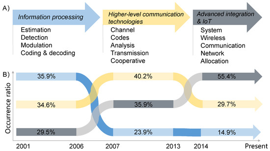 Development of communication technologies from 2001 based on keyword extraction from IEEE transaction on communications. (A) The three stages of development trend. Keywords of Information processing, Higher-level communication technologies and Advanced integration and Internet of Things (IoT) were showed under blue, yellow and gray arrows, respectively. (B) The occurrence ratio of extracted keywords in the field of Information processing, Higher-level communication technologies and Advanced integration and IoT along with time. The x-axis showed the timeline of communication technology development, while the y-axis showed the rank of three stages based on their corresponding keywords occurrence ratio.