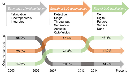 Figure 3 summarized the development of Lab on a Chip technologies from 2003 based on keyword extraction from Lab on a Chip. Figure 3A showed the three stages of development of LoC technologies, which are Early days of miniaturization, Growth of LoC technologies and Rise of LoC applications. Figure 3B depicted the trend of how three stages were evolved.