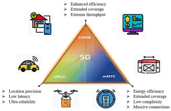 In the current applications of cellular devices, there is a great demand for incorporating 5G networks as a replacement for the 4G type. Generally, the Machine to Machine (M2M), Device to Device (D2D), massive Machine Type Communications (mMTC) and mobile phone technologies improve instantly [1]. The 5G solution provides the means to satisfy advanced networking in terms of high bandwidth capacity, traffic rate, availability and connectivity [2]. The enhanced Mobile Broadband (eMBB) is an extension of the mobile broadband telecommunication standards. It provides multiple connectivity (e.g., hotspot or wide-area coverage) with high data rates of services and multimedia data. Ultra-Reliable Low Latency Communications (URLLC) are used for machine-type communications and provide better latency and reliability. Its applications include distribution automation in smart grids, industrial manufacturing and remotely driven vehicles. The mMTC provides massive connectivity with a low amount of traffic and possible delays. Its applications include Internet of Things (IoT) systems [1]. These three communication approaches manifest the dimensions of features in the 5G network, as shown in Figure 1.