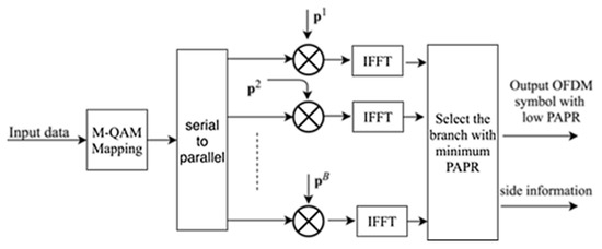 Partial Transmit Sequences (PTS) [23] and Selected Mapping (SLM) [24] are two methods that belong to both time-and frequency-domains and assist in PAPR reduction. They use a statistical mechanism that avoids increasing the BER. However, the PTS needs more side information than the SLM, which decrease the capacity of the transmitted data and causes data rate reduction. Hence, the SLM is extensively integrated with different waveforms [16]. For example, Figure 2 shows the SLM and CP-OFDM integration in which multiple copies or branch of the original data are generated. Each copy is multiplied by the corresponding phase rotation vector, p^ (1, 2, …). In Figure 2, the fast version Inverse Fast Fourier Transform (IFFT) is used to transform between frequency-and time-domains. The branch with minimum PAPR is adopted for transmission along with the needed side information. This side information is a strongly protected small number of binary bits that guarantee correct data recovery at the receiving end [25,26]. However, side information protection and transmitting are not within the scope of this work.