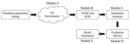 The experimental tests of the simulation aim to improve the 5G performance by decreasing the PAPR and BER. The SLM-UFMC is proposed to find the optimum wave with the lowest PAPR and CM levels. Afterwards, three existing waveforms are tested via simulation program and the results are compared with the SLM-UFMC. Figure 3 represents the main steps that are used to implement the simulation of the SLM-UFMC and the other waveforms. The simulation model consists of five main modules. Firstly, the 5G environment Module A is employed to create simulation environments. This module integrates the main characteristics of 5G, such as data rate, packet size and a number of devices. Module B represents the implementation of the SLM-UFMC model and the existing UFMC [11] and SLM-CP-OFDM [20] models. In this module, several windows have been included to address the progress of the solutions. In Module C, different numbers of QAMs (e.g., four, eight, 16, 64, 256) are employed to generate testing scenarios with various states to comprehensively assess the performance of the proposed model compared with the tested waveforms. The scenarios are altered in each set of runs of a particular waveform. In Module D, the performance metrics of CCDF and BER are implemented to evaluate the SLM-UFMC, SLM-CP-OFDM, and conventional UFMC. Finally, Module E depicts the results and visualization graphs in a windows form.