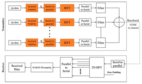 In 5G, UFMC is a novel multicarrier modulation of QAM type that represents an alternative to the OFDM and FBMC waveforms. Unlike self-subcarrier modulation in FBMC, a group of subcarrier modulation is performed in UFMC. The subcarrier grouping reduces the length of the filter compared with FBMC and also reduces the performance time. Starting from the traditional OFDM system, UFMC can be considered as a generalized version of the OFDM. Let the OFDM be formulated based on Equation (3)
