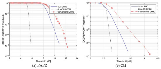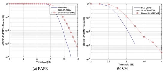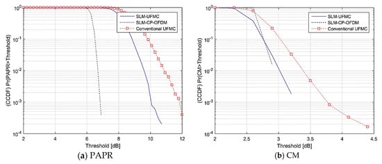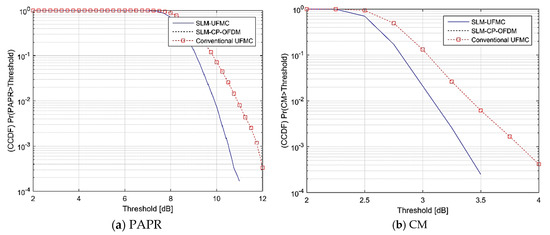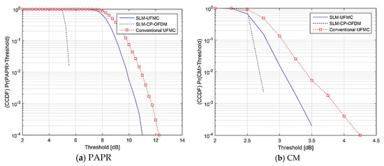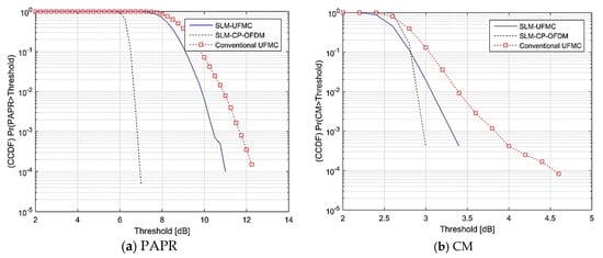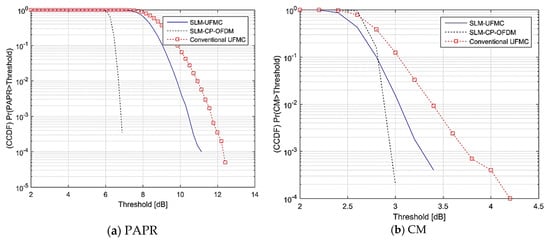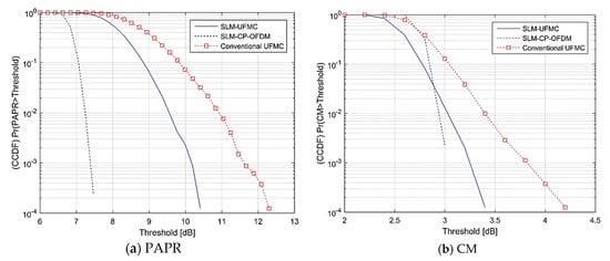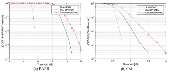 In the second scenario of Table 1, the modulation order is increased to four binary bits in each subcarrier, and hence the 16-QAM mapping is conducted in its simulations. With 16-QAM and 4-PRV, the conventional UFMC reduces the PAPR and CM from 12 and 4 dB to 10.75 and 3.5 dB, respectively. Subsequently, the SLM-UFMC reduces the PAPR and CM to 1.25 dB and 0.5 dB as shown in Figure 8a,b. The SLM-CP-OFDM shows better PAPR performance than SLM-UFMC, but at the cost of spectrum deficiency.