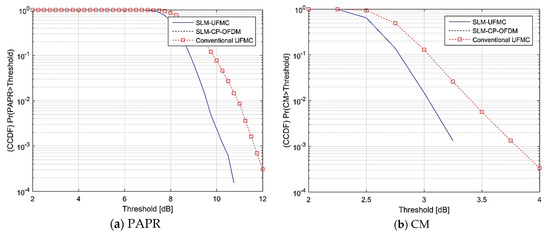 The simulation with 6-PRV generally enhances the PAPR, in which it is reduced from 12.4 to 11.1 dB, as shown in Figure 11a. The CM has no improvement as compared with the 4-PRV, in which the same result of 1.2 dB is obtained, as shown in Figure 12b. Increasing the number of PRV to eight did not improve the PAPR and MC, as shown in Figure 13a,b. Thus, it is meaningless to increase the computational complexity by increasing the PRV. As shown in Table 4, the same behaviour of SLM-CP-OFDM is significantly shown, in which the CM is reduced by more than SLM-UFMC.