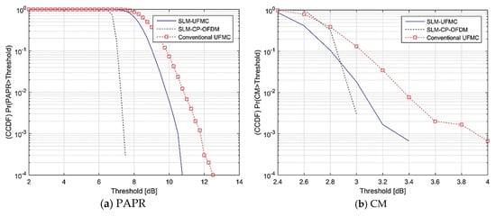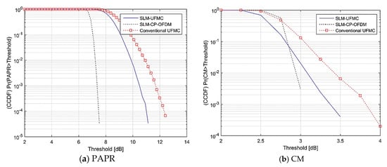 In the same scenario of 16-QAM, the number of PRV increased to six (6-PRV). Figure 9a shows that the PAPR of the conventional UFMC is 12.25 dB. The PAPR is reduced to 11 dB, with a reduction of 1.25 dB. The CM in Figure 9b of the conventional UFMC is 4.25 dB, while in the SLM-UFMC, it drops to 3.5 dB, with a reduction of 0.75 dB. It can be seen that using 4- or 6-PRV does not make a significant change in the PAPR and CM, as shown in Table 3. The SLM-CP-OFDM in both cases has a greater reduction in the PAPR and CM, but it is impossible to use CP-OFDM for different numerologies, which is why we are seeking other waveforms.