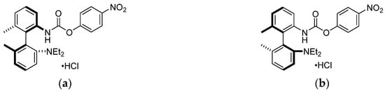 Structures of the chirality-switchable biaryl axially chiral tags (a) (R)-4-nitrophenyl-N-[2-(diethylamino)-6,6-dimethyl-[1,1-biphenyl]-2-yl]carbamate hydrochloride (BiAC) and (b) (S)-BiAC.