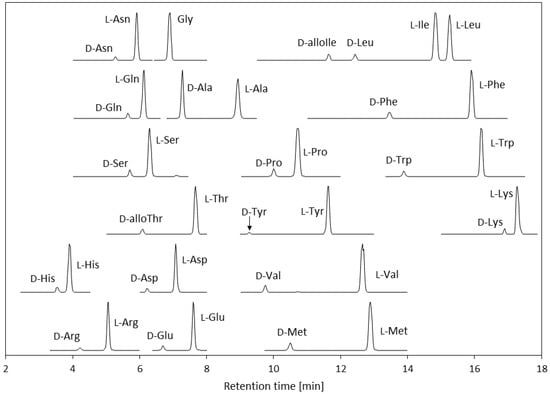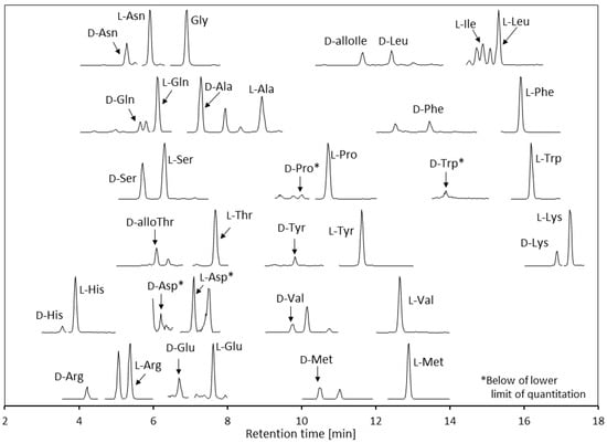 Advances in chiral analysis have allowed detailed studies of d-amino acid functions to be performed []. Chromatographic separation techniques such as high-performance liquid chromatography (HPLC) and gas chromatography have generally been used to separate d- and l-amino acids. Chiral HPLC has most often been used for such analyses. Analyses have been performed using two- or three-dimensional HPLC with fluorescent derivatization [,,], chiral HPLC of derivatized amino acids with mass spectrometry (MS) [,], and chiral HPLC of underivatized free amino acids with MS [,]. Two- or three-dimensional HPLC is selective and accurate but time-consuming and requires complex instrumentation. Derivatization followed by HPLC analysis with MS still requires more than 40 min per analysis for simultaneous determination, or only limited amino acids can be analyzed. Methods without derivatization cannot separate d,l-proline (Pro), and are prone to matrix interferences, but can give fast analyses. Using chiral gas chromatography with harsh derivatization at a high temperature means some unstable amino acids have to be analyzed as the sums of amino acid concentrations (e.g., Asp as asparagine (Asn) plus Asp and glutamate (Glu) as glutamine (Gln) plus Glu), although good separation can be achieved.