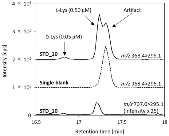 Standard 10 (STD_10) and blank chromatograms of d,l-lysine (Lys) showing the artifact that overlapped the l-Lys peak when the m/z 368.4 > 295.1 transition was monitored.
