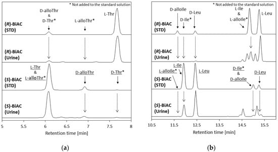 Chromatograms of standards and pooled urine samples derivatized using (R)-4-nitrophenyl-N-[2-(diethylamino)-6,6-dimethyl-[1,1-biphenyl]-2-yl]carbamate hydrochloride (BiAC) or (S)-BiAC. (a) Isomers of threonine (Thr). (b) Isomers of isoleucine (Ile) and leucine (Leu).