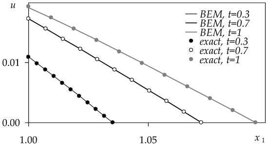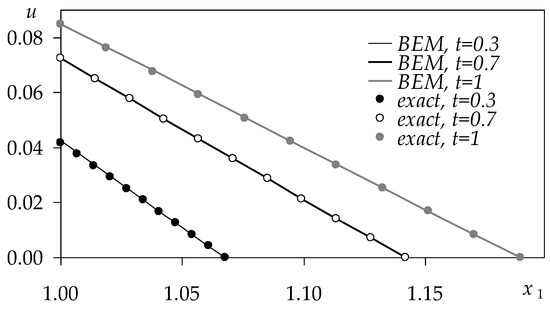 In Example 2, the BEM solution is compared with the exact solution, (48), for the following parameter values: , , , , . The comparison is shown in Figure 2.