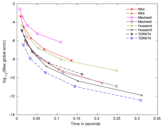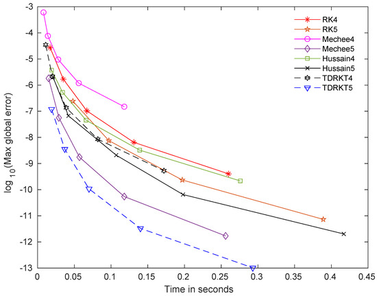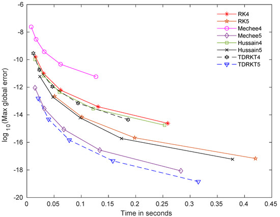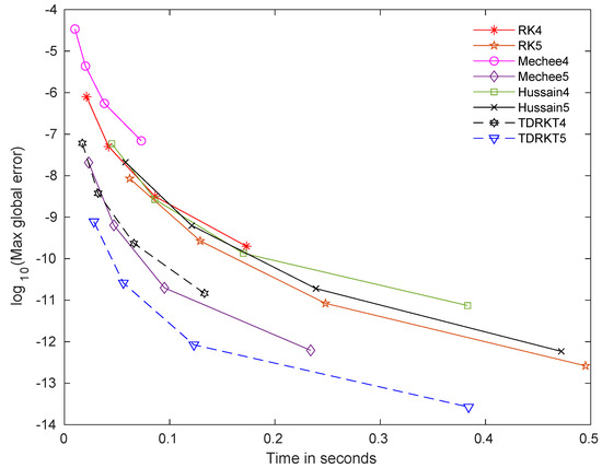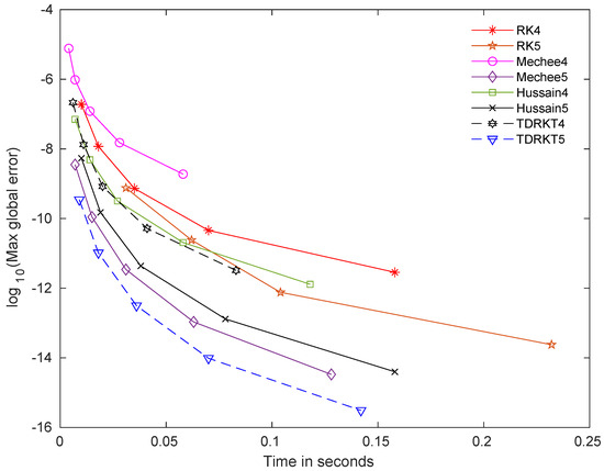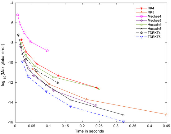 From the figures above, it is clearly exhibited that TDRKT methods are more proficient than traditional Runge–Kutta methods and direct Runge–Kutta methods in terms of maximum global error versus computational time. TDRKT methods acquired higher accuracy with the same amount of algebraic order compared to traditional Runge–Kutta type methods. Numerical experiments displayed the great performance from TDRKT methods by generating the least maximum global error with the same computational time compared to existing Runge–Kutta type methods.