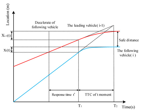 In Figure 3, if the following vehicle speed is greater than the leading vehicle speed, when the following vehicle is in moment it is always found that the distance from the leading vehicle is getting smaller and smaller. If no hedging measures are taken, the vehicle will have traffic conflicts occur in moment; if the following vehicle adopts risk-avoidance measures, the two vehicles continue to drive at a certain safe distance, the reaction time of the driver of the following vehicle is , and the calculation formula of TTC is as follows: